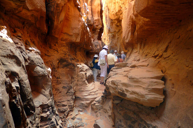 In den Morgenstunden machen wir uns gleich auf den Weg zum Höhepunkt unserer Reise. Wir fahren in die rosarote Felsenstadt Petra, das zu den eindrucksvollsten Ruinenstätten der Welt gehört. Ihren Namen - das griechische »Petra« bedeutet »Fels« - erhielt sie wegen der roten Sandsteinfelsen. Hier erfahren wir manches über die Funktion der rätselhaften aus dem Stein geschlagenen Monumente und die Geschichte der Nabatäer. Wir staunen über die Fassaden und Skulpturen sowie die schillernden Farben des Sandsteins, die Petra so einmalig machen. Am Ende der Schlucht, dem sogenannten »Siq«, eröffnet sich durch einen zunächst winzigen Spalt ein atemberaubender Blick auf das Schatzhaus! Wir erfahren Details über die Schatzkammer, das Theater, die Königsgräber und die Stadtanlage um das Forum. 190 km (F, A)