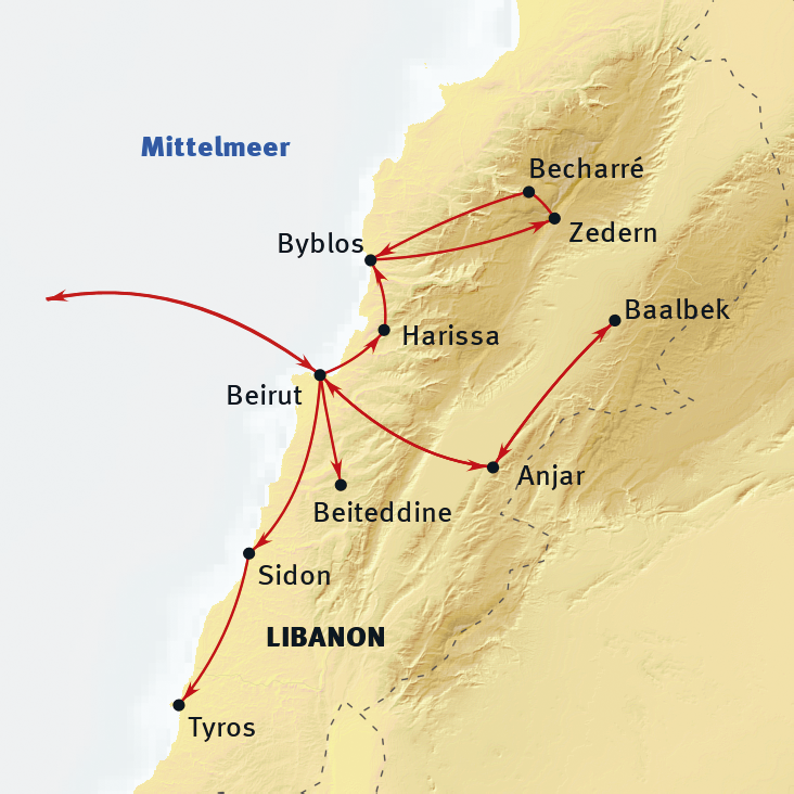 Beirut - Tyros - Sidon - Harissa - Byblos - Zedern - Becharré - Jeita - Faqra - Baalbek - Anjar - Dair al Qamar - Beiteddine - Barouk - Beirut